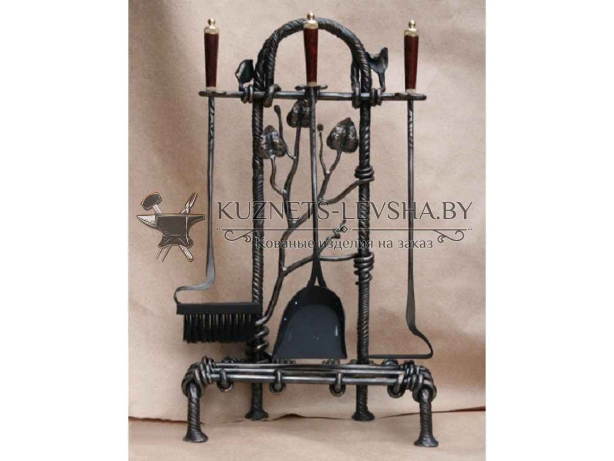 Набор состоит из 3 элементов: кочерга, совок и метелка. Все элементы вместе с подставкой выполнены в едином стиле и кроме своего основного назначения  послужат немаловажной частью декора вашего камина.