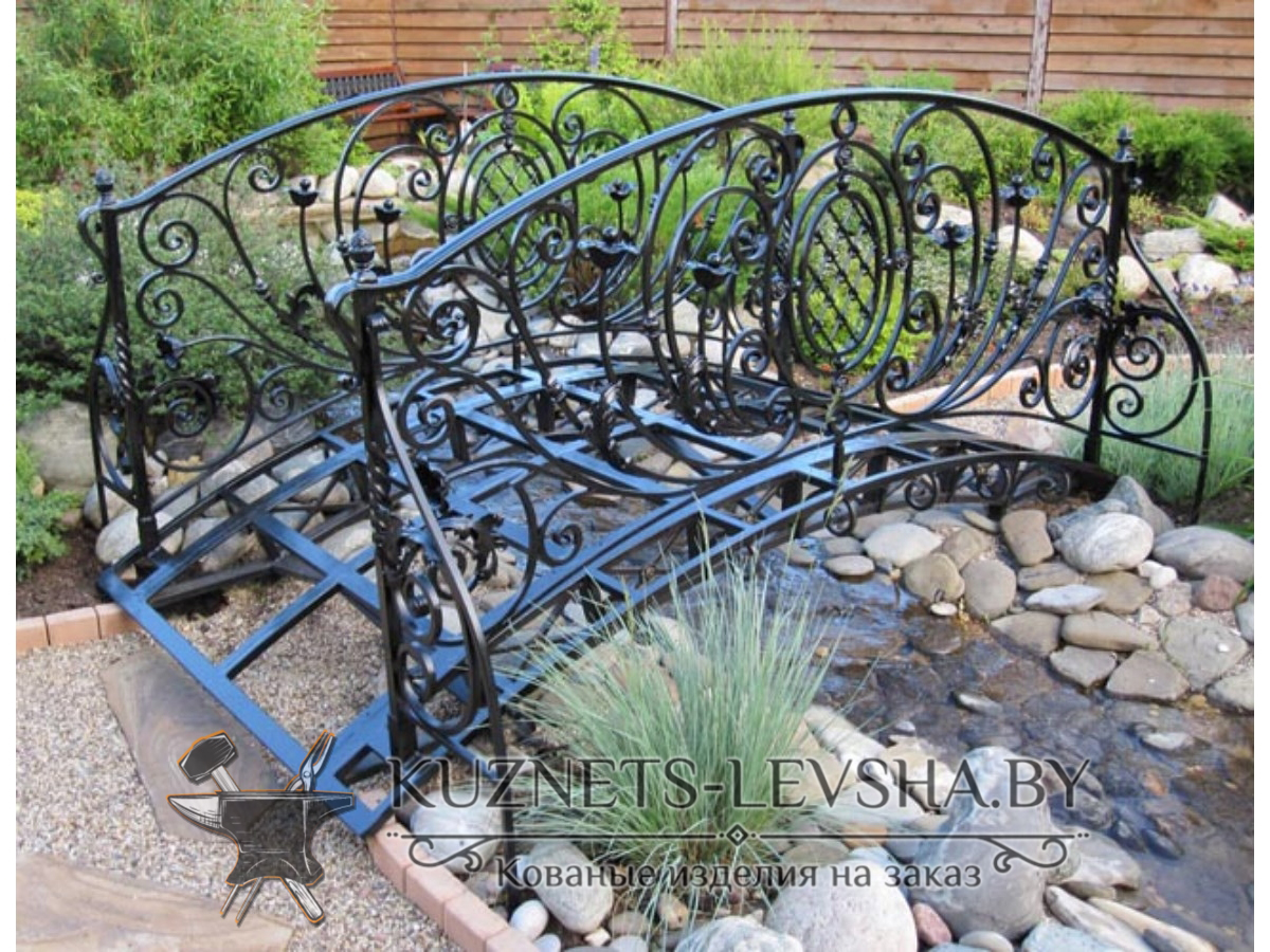 Цветы, завитки, гирлянды и др.элементы оформления подбирают с особой тщательностью, и мост, изготовленный по вашему заказу или по эскизу, предложенному опытными мастерами, станет достойным воплощением самых смелых идей. Прекрасным дополнением может стать выполненное в том же ключе ограждение. Особенно прелестно выглядят кованые мосты и мостики, созданные из тонких узоров – имея довольно внушительный вес и обладая завидной прочностью, они словно парят в воздухе. Такие кованые изделия могут нести только эстетическую нагрузку - в таком случае предпочтителен мостик в виде стильной арки.